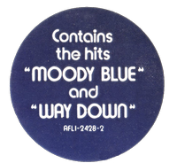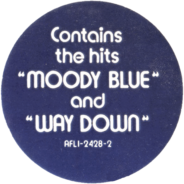 Stickers: Applied to shrink-wrap announcing “The Blue Album” and “Contains the hits Moody Blue and Way Down.”