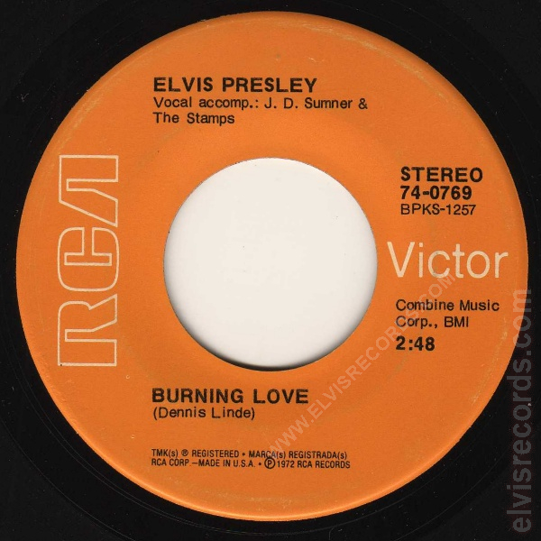 Disc: (8/1972) Orange label. On both sides “Vocal accomp” under Elvis Presley is lower case “accomp”. On the Burning Love side, Combine Music Corp., BMI is on two lines.