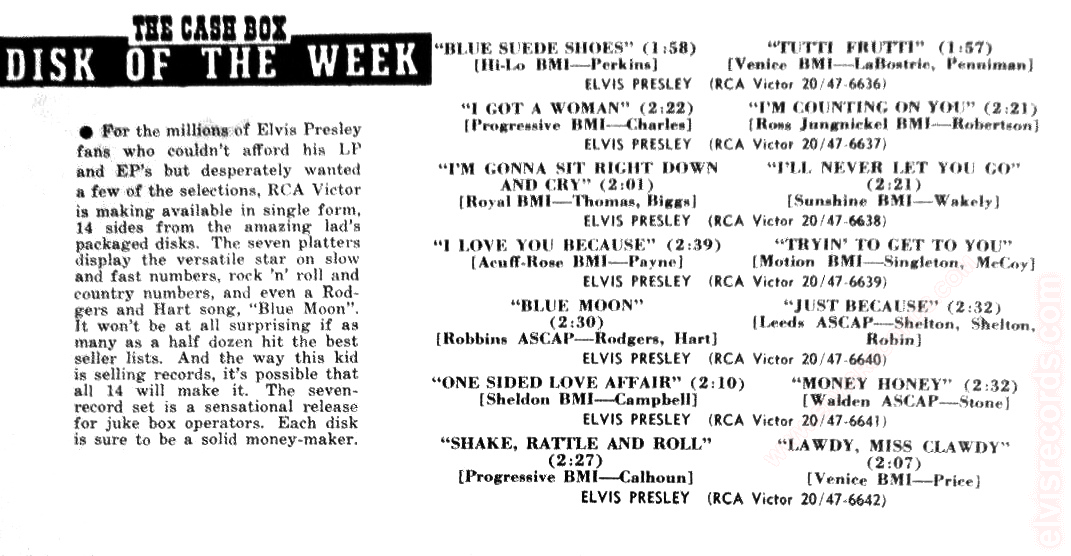 For the millions of Elvis Presley fans who couldn’t afford his LP and EP’s but desperately wanted a few of the selections, RCA Victor is making available in single form, 14 sides from the amazing lad’s packaged disks. The seven platters display the versatile star on slow and fast number, rock ‘n’ roll and country numbers, and even a Rodgers and Hart song, “Blue Moon”. It won’t be at all surprising if as many as a half dozen hit the best seller lists. And the way this kid is selling records, it’s possible that all 14 will make it. The seven record set is a sensational release for juke box operators. Each disk is sure to be a solid money-maker.1