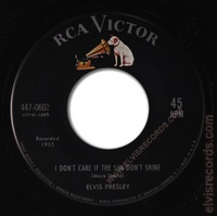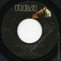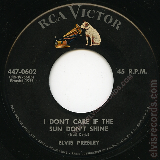 Disc: 4/1964. Gold Standard. Black label, dog on top. On right side, 45 RPM on two lines. I DON’T CARE IF THE SUN DON’T SHINE on one line. Camden, N.J. on labels.