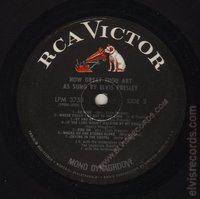 Disc: Mono Dynagrove. Black label, RCA logo is white, other label print is silver. HOW GREAT THOU ART AS SUNG BY ELVIS PRESLEY in all caps. No Elvis Presley above spindle. Side 1, track 3 correctly credits Lange-heath-Burke. Side 1, track 4 on one line. eith the Jordanaires and The Imperials Quartet two lines. On side 2, the Jordanaires and The Imperials Quartet are credited 1-6.