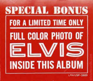Red and white, reads: “Special Bonus, for a limited time only, full color photo of Elvis.”