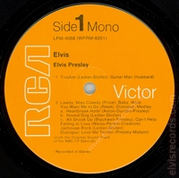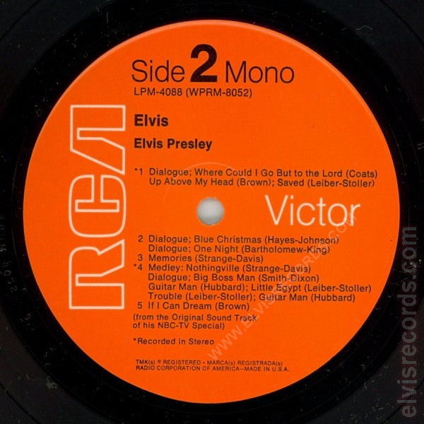Sticker: Later copies may contain a 1 1/8″ x 4″ blue sticker reading “MEMORIES OF ELVIS NBC-TV SHOW – NOVEMBER 1977 – PART 1 (FROM THE ORIGINAL SOUNDTRACK RECORDING OF THE 1968 TV SPECIAL) LPM-4088