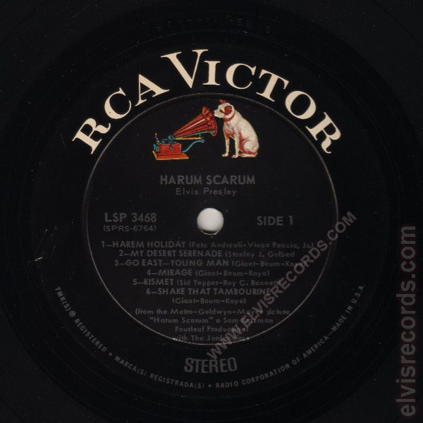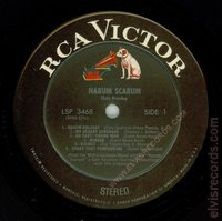 Disc: Stereo. Black label, RCA logo is white, other label print is silver. HARUM SCARUM and Elvis Presley below dog and above spindle hole.