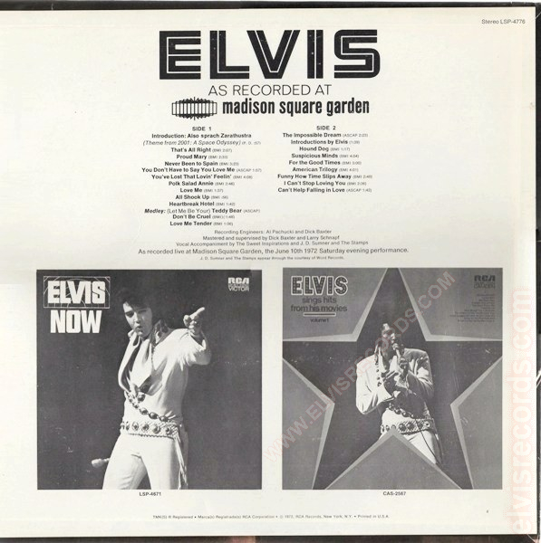 Also released as a radio station banded version as SPS-33-571 (LSP-4776) Elvis As Recorded at Madison Square Garden in 1972.